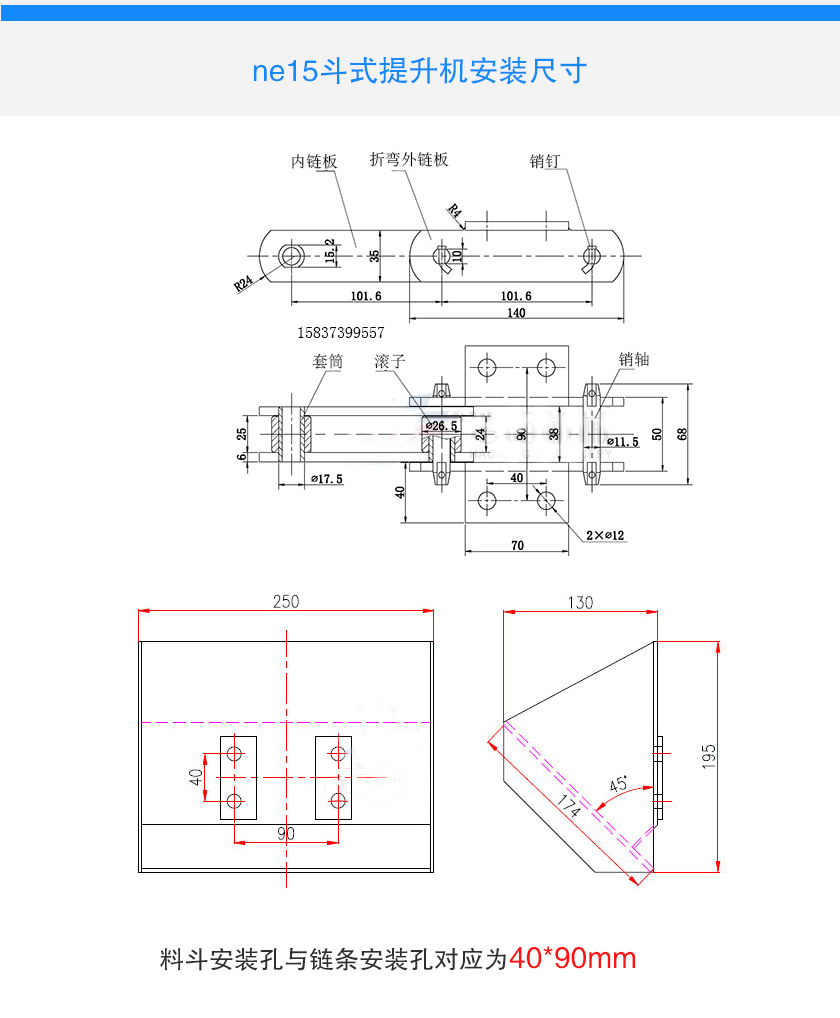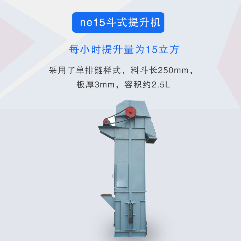 ne15斗式提升機料斗長250mm,板厚3mm,容積約2.5L,每小時提升量為15立方,ne15斗式提升機采用板式鏈條,耐磨性強,適合垂直提升粉狀及塊狀物料.