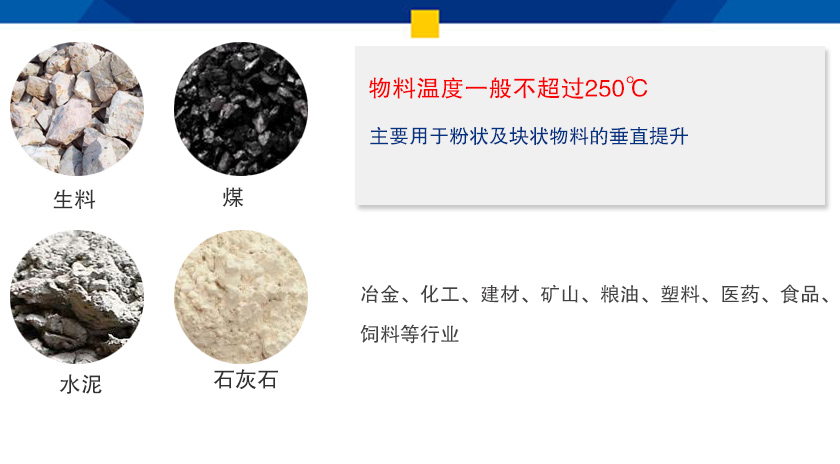 ne15斗式提升機主要用于粉狀及塊狀物料的垂直提升,如生料、水泥、煤、石灰石、干粘土、熟料等,物料溫度一般不超過250℃,冶金、化工、建材、礦山、糧油、塑料、醫(yī)藥、食品、飼料等行業(yè)。