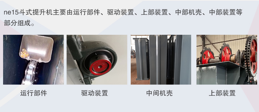 ne15斗式提升機主要由運行部件、驅(qū)動裝置、上部裝置、中部機殼、中部裝置等部分組成。