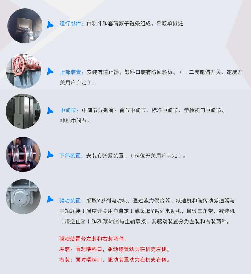 運行部件——由料斗和套筒滾子鏈條組成,采取單排鏈。